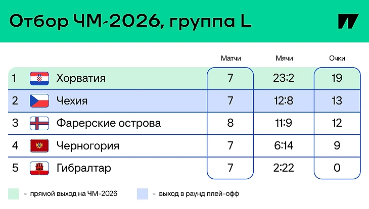 В этой группе все решено: Хорватия вышла на ЧМ-2026, Чехия точно в стыках. Фареры могли зацепиться, но после четвертого поражения шансов на второе место нет.