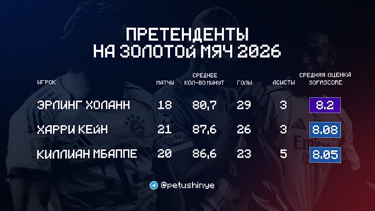 В этом году заруба за «Золотой мяч» будет как никогда серьёзной! Помимо Кейна, на главную индивидуальную награду претендуют Мбаппе и Холанн — оба выдают сумасшедшие сезоны с какими-то недосягаемыми для простых смертных цифрами.