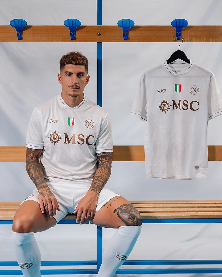 Выездной комплект неаполитанцев — арт-объект, посвященный идентичности родного для клуба города. Золотой гравировкой на белом фоне дизайнеры изобразили девять знаковых элементов местной культуры, среди которых, например, Моначьелло, магическая и таинственная фигура, олицетворяющая народную традицию домашних духов, а также символ хитрости, иронии и умения справляться с трудностями — маска Пульчинеллы. Венчает футболку надпись сзади на воротнике: «Горжусь быть «Наполи»».