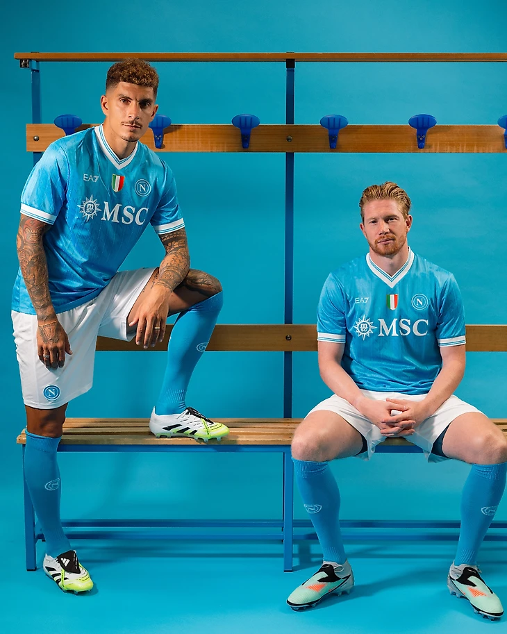 Словно Кевин и не уходил из Манчестера. Базовая для команды голубая расцветка, узор из культовой буквы N и трехцветный щит «Скудетто» на груди — элегантный поклон традициям «Наполи».