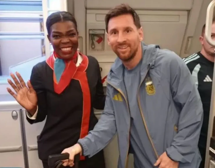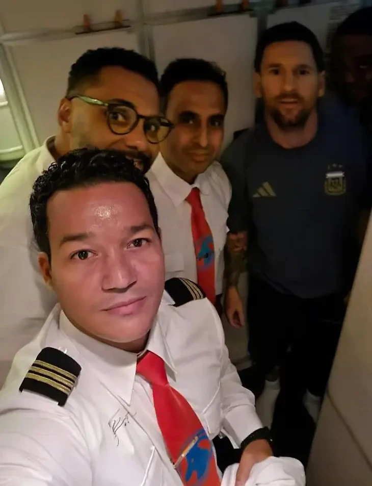 Пока все пытались сделать фото с Лео, экипаж TAAG тоже решил не упускать момент. Пилоты и бортпроводники выстроились для снимков, но один пилот пошел дальше всех: попросил автограф. Бумаги и футболки не было — и Месси спокойно поставил подпись прямо на его белоснежной официальной рубашке.