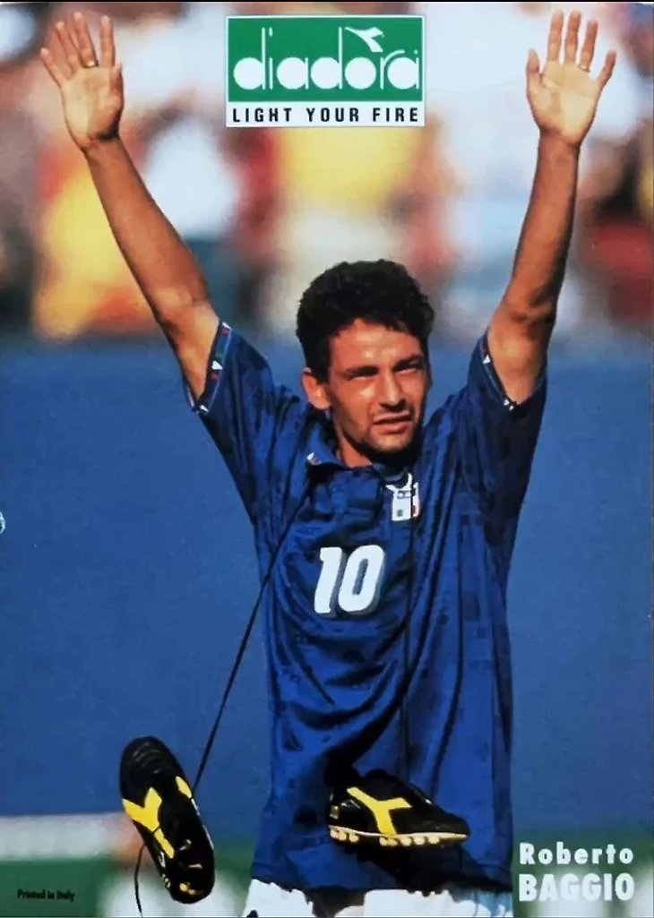 Вспомните Пасадену, 17 июля 1994 года. Роберто Баджо пробивает тот самый роковой пенальти. Но запоминается не только его промах, но и образ: чёрные бутсы и жёлтый логотип Diadora. В те годы, когда футболисты стали поп-звёздами, а спонсорство — неотъемлемой частью игры, Баджо стал главным лицом венецианского бренда. Их партнёрство прошло через годы, вплоть до светло-голубых бутс в его «просветлённые» годы в «Брешии».