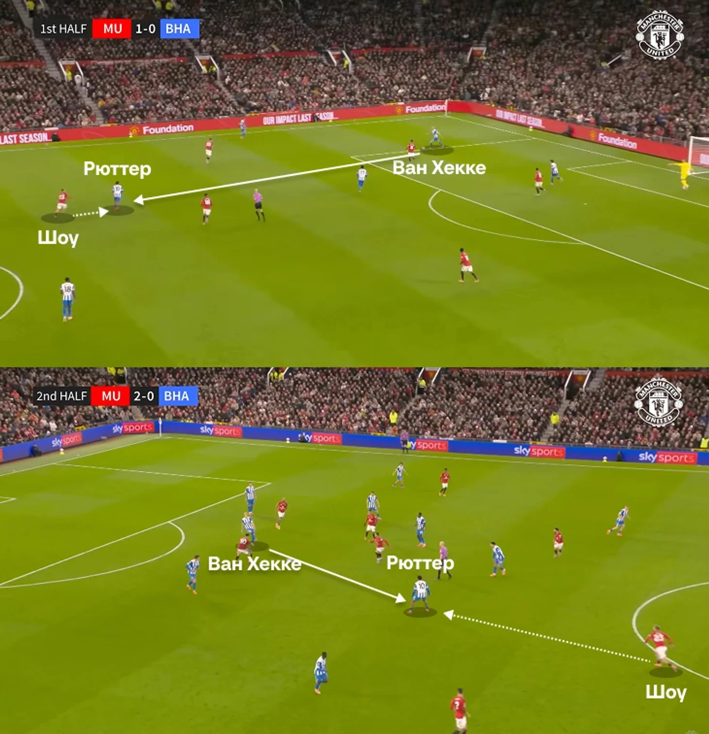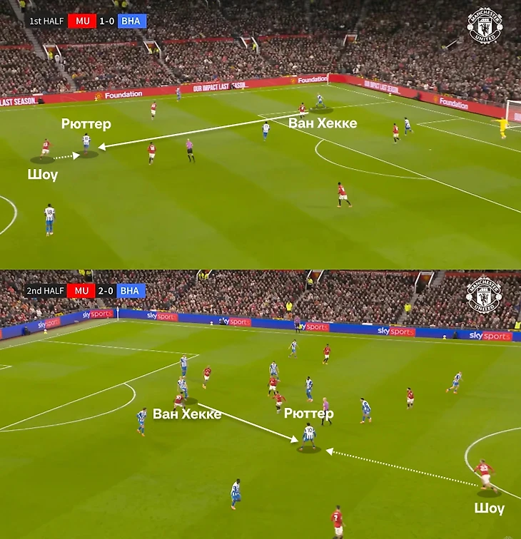 Когда ЦЗ отнимает мяч так высоко, команда мгновенно получает численное преимущество для контратаки. Лучший пример – голы в ворота «Брайтона» (4:2). В первом моменте Люк Шоу прочитал пас на Жоржиньо Рюттера, выдвинулся в полузащиту, чисто отобрал мяч – «Юнайтед» тут же начал голевую атаку, поймав «Брайтон» в переходной фазе. Во втором тайме Шоу провернул этот трюк еще раз, запустив комбинацию на третий гол.