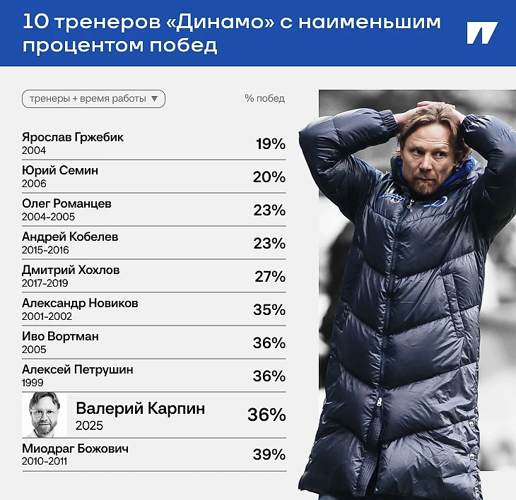 По проценту побед Карпин – в десятке худших среди всех тренеров «Динамо» в чемпионате России. Там только те, кто не набрал и 40%.