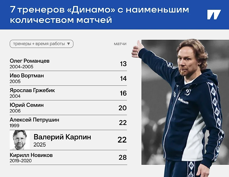 За российский период в семерке тренеров «Динамо», которых утверждали главными, Карпин делит пятое место по наименьшему числу матчей.