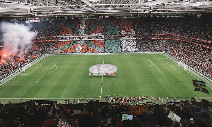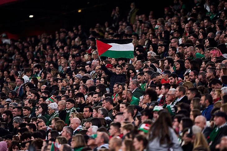 Уже на стадионе баскские фанаты создали масштабную мозаику: бискайский и палестинский флаги рядом. Цвета почти одинаковые: красный, зеленый, белый и черный.