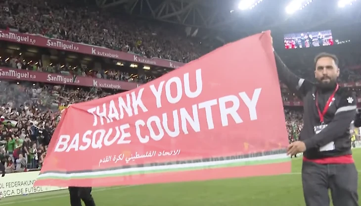 После свистка тренер Абу Джазар вывел палестинцев на круг почета: они поблагодарили стадион аплодисментами и баннером «Спасибо, Страна Басков».