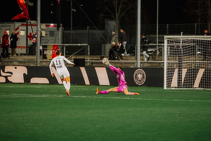 Оборону «Айнтрахта» и правда штормило. На 17-й минуте уже Пиа-Софи Вольтер по сути отпасовала прямо на Лоре Якобс, которая от души приложилась к мячу - Альтенбург спасла команду.