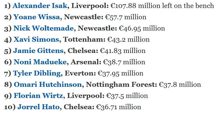 По формуле, предложенной ESPN, худшим оказался переход Александера Исака из «Ньюкасла» в «Ливерпуль». Плохая форма, травмы привели к тому, что швед отыграл за «красных» всего восемь матчей – 429 минут на поле. По оценке ESPN, Исак оставил на скамейке мерсисайдцев 107,88 млн евро. В десятке худших есть и трансфер Флориана Виртца, но поскольку он выходил на поле гораздо чаще, немец расположился на девятой строчке.