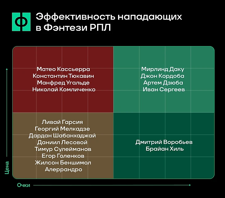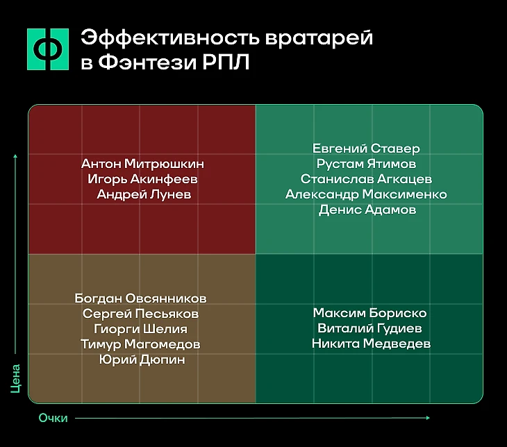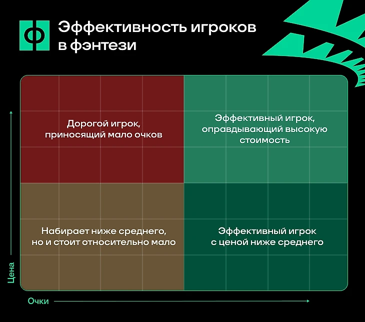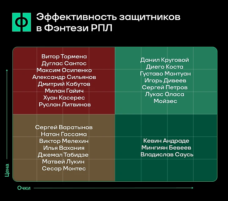 На каждой позиции мы выбрали лучших по среднему числу фэнтези-очков за игру и составили соотношение «цена/качество». Есть четыре категории, вот по такой схеме.