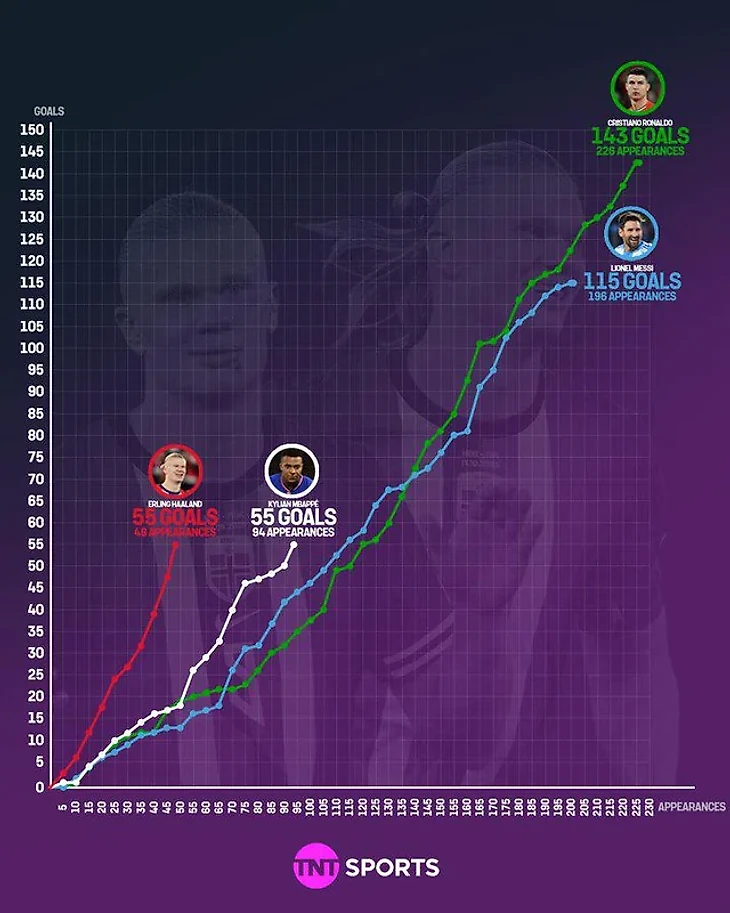 Нетрудно прикинуть, что для того, чтобы догнать Криштиану Роналду, Эрлингу Холанду нужно держать такой же темп более ста матчей, но чуть меньше, если португалец перестанет забивать.