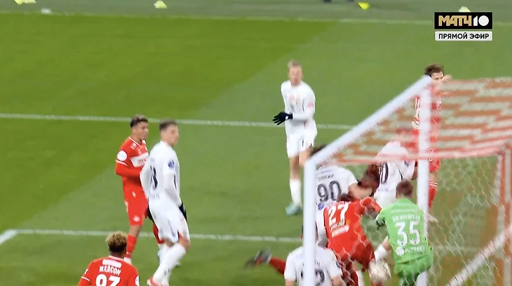 Вот тут примерно видно и то, где пролетел мяч, и чем недовлен Акинфеев: есть контакт с Дмитриевым.