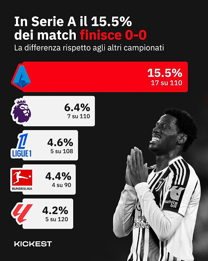 Чемпионат Италии стал самым малорезультативным среди пяти топ-лиг Европы. Из 110 матчей текущего сезона 17 завершились со счётом 0:0 — это 15,5% от общего числа встреч. Для сравнения: в АПЛ лишь 6,4% матчей закончились без голов, во Франции — 4,6%, в Германии — 4,4%, а в Испании — 4,2%.
