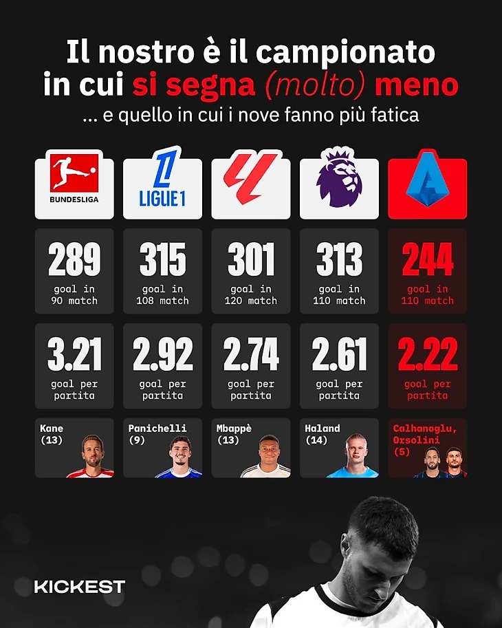 Ситуация отражается и в списке бомбардиров: если в Германии лидирует Харри Кейн (13 голов), во Франции — Хоакин Паничелли (9), в Испании — Килиан Мбаппе (13), в Англии — Эрлинг Холанд (14), то в Италии — всего лишь Хакан Чалханоглу и Риккардо Орсолини с 5 мячами.