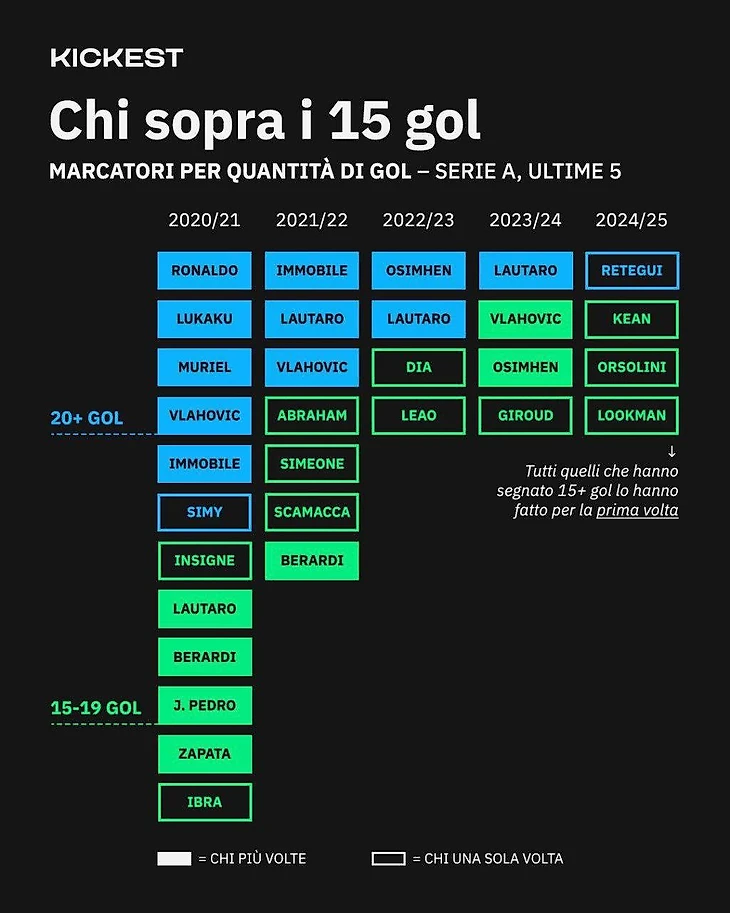 С 2017 по 2022 год Серия A неизменно преодолевала рубеж в 1000 голов за сезон, а рекорд был установлен в кампании-2020/21 — 1163 мяча. Однако в последние три года тенденция ухудшилась: прошлый сезон завершился с показателем 973 гола — минимальным с сезона 2011/12 (971).