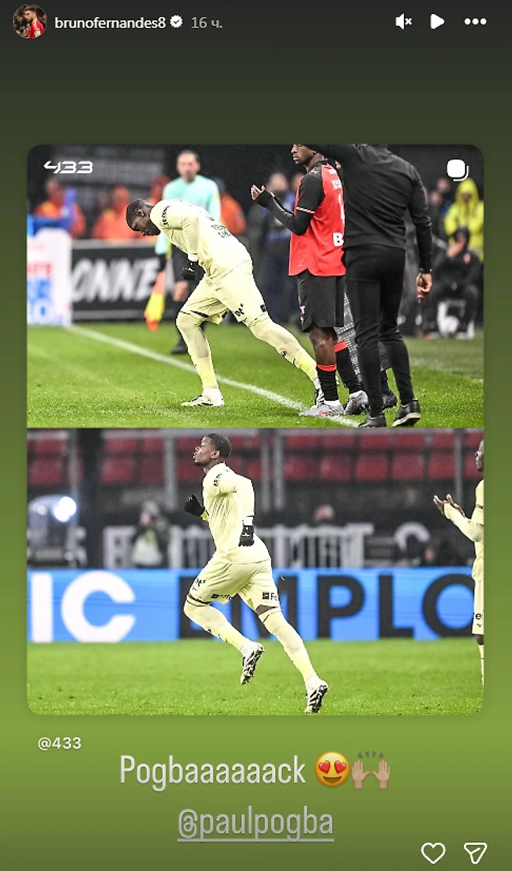 Возвращение Поля Погба вызвало большой резонанс. Одним из тех, кто отреагировал на это, был капитан «Манчестер Юнайтед» Бруну Фернандеш. Он опубликовал следующую сториз.