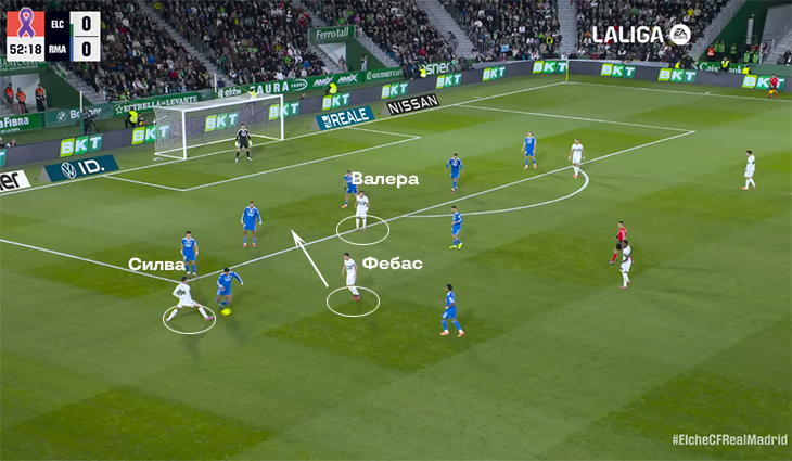 «Эльче» играет в яркий комбинационный футбол с акцентом на владение мячом. Даже с «Реалом» выбили почти половину. Это интересная команда ученика Кике Сетьена. Базис игры тренера Сарабии – поиск и правильная интерпретация пространства при владении. И пример – гол хавбека Алейша Фебаса: латераль Херман Валера и форвард Андре Силва поменялись местами и запутали защиту, чем создали коридор для Фебаса.
