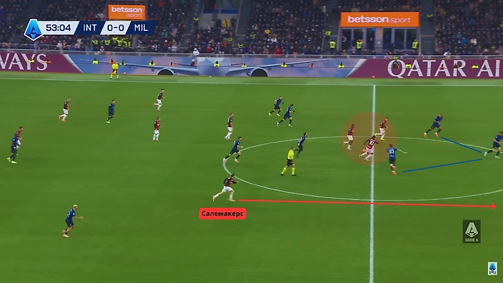 В голевой атаке Пулишич, Леау и Фофана предельно сузили действо. Защита «Интера» перекрыла центр 1-в-1, но разместилась так узко, что Салемакерсу, забегавшему вторым темпом, даже не пришлось играть особенно широко: он смог остаться в канале, из которого нес непосредственную угрозу, и при этом атаковать без помех.