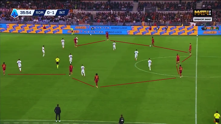 Джан Пьеро потребовалось время, чтобы поставить коронные розыгрыши на краю. Первое время римляне хорошо ограничивали соперника плотным персональным прессингом, но слишком просто играли с мячом. Владение Гасперини строится во фланговых ромбах с заранее отрепетированной, но сложной ротацией. «Роме» понадобилось несколько месяцев, чтобы ее усвоить. Стремление играть через края, как принято у тренера, и плохо поставленная механика постоянно приводили к вот таким беззубым структурам.