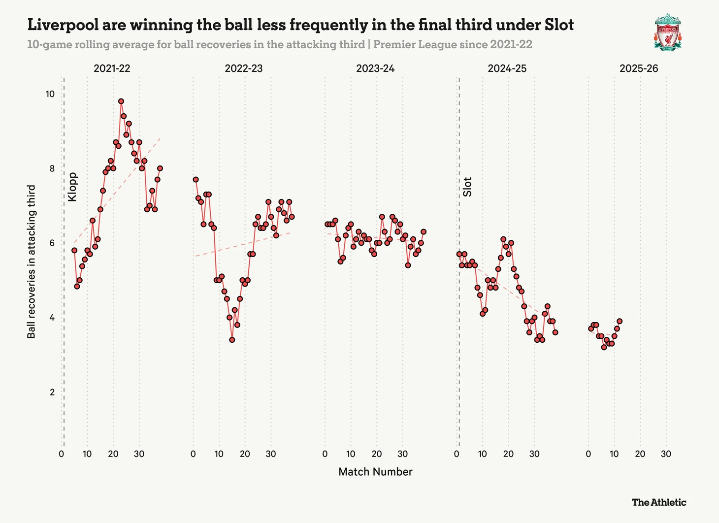 «Ливерпуль», что вполне объяснимо из-за изменений в расположении нападающих, прессинговал не так успешно, как в прошлом сезоне. На это повлияли особенности игры соперника, поскольку средний показатель отборов мяча в атакующей зоне за 10 игр у команды значительно снизился.