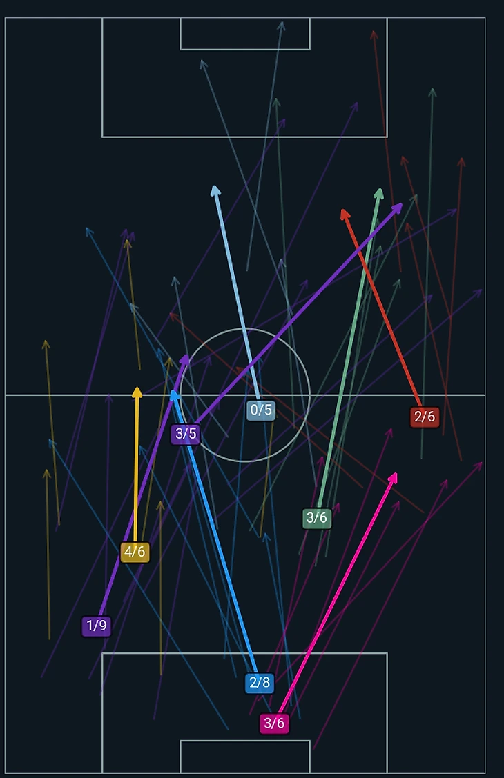 Намного эффективнее «мюнхенцы атаковали через длинные передачи. В первые 20 минут «Мюнхен» не пользовался ими, как основным оружием, по возможности разыгрывая через короткий пас. Но к концу первой половины тайма лонгболлы превратились в основной инструмент развития атак.