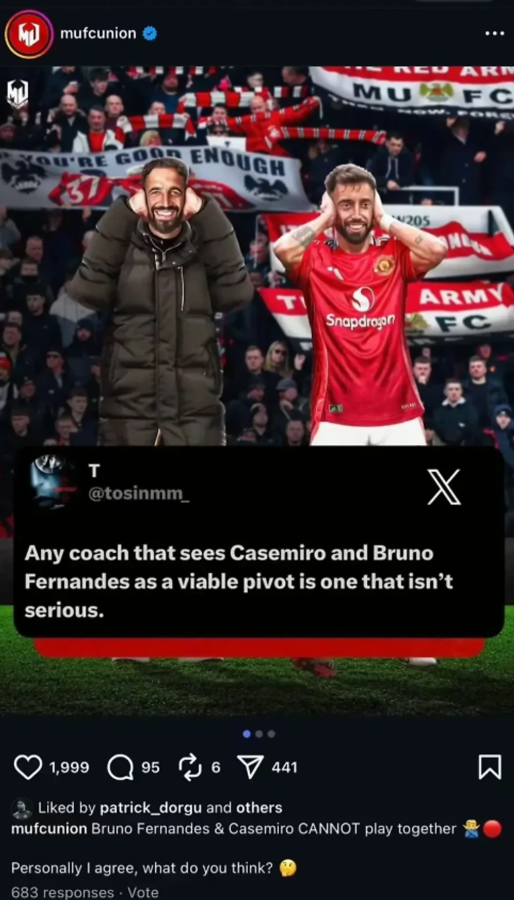 Болельщики заметили, что Патрик лайкнул пост в инстаграм с критикой Рубена Аморима. В нем было написано: «Любой тренер, который считает Каземиро и Бруну Фернандеша пригодной парой опорных полузащитников — несерьезный».