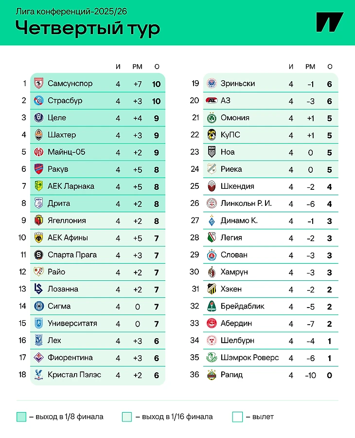 Лига конференций вернется 11 декабря. Главные вывески: «Райо» поедет к «Ягеллонии», «Фиорентина» примет киевское «Динамо», «Пэлас» проверит «Шелбурн», «Страсбур» встретится с «Абердином».