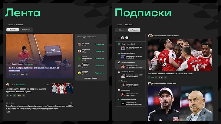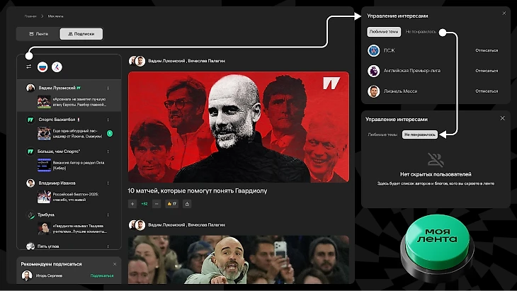 «Моя лента» – обновленный раздел с индивидуальными настройками. Внутри можно переключаться между собранной алгоритмами «Лентой» и «Подписками». С подписками понятно – там будут обновления блогов, на которые вы подписались. А вот с лентой интереснее: туда прилетят главные новости, а также посты редакции и Трибуны, которые предложат алгоритмы на основе ваших интересов. Чем больше взаимодействуете с определенным контентом, тем точнее рекомендации.