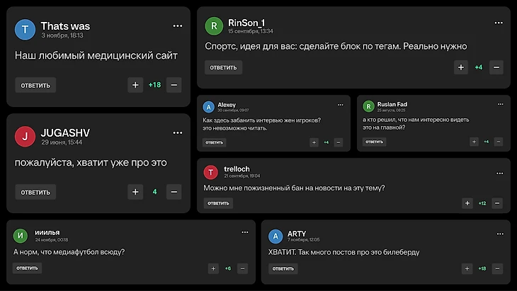 Еще в комментариях просят не постить новости с определенными героями, возмущаются текстами из определенного раздела или выбранными темами.