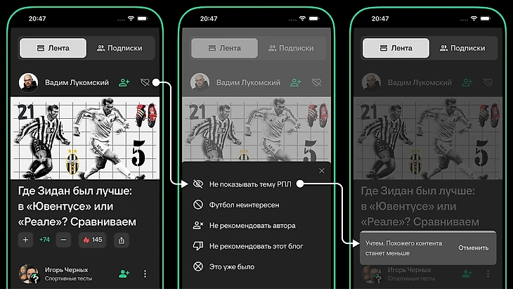 ● Во время просмотра ленты можно исключать повторяющиеся посты и новости, а также пополнять черный список авторов и блогов. Это улучшит рекомендации в дальнейшем.