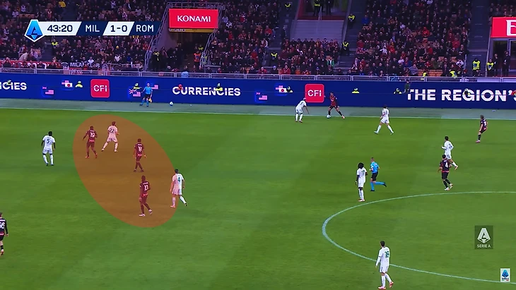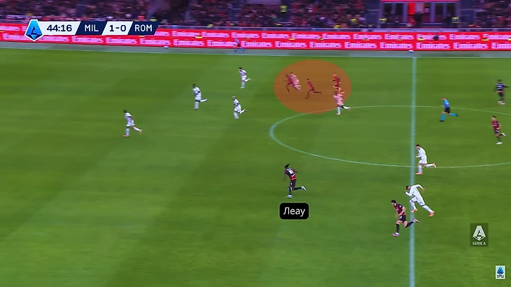 А вот гол «Роме». Здесь действо началось справа. Характерно, что игроки даже не разбежались во время контратаки; их задача – держать римлян как можно ближе к себе. Этим они создали для Леау ситуацию 1-в-1 слева.