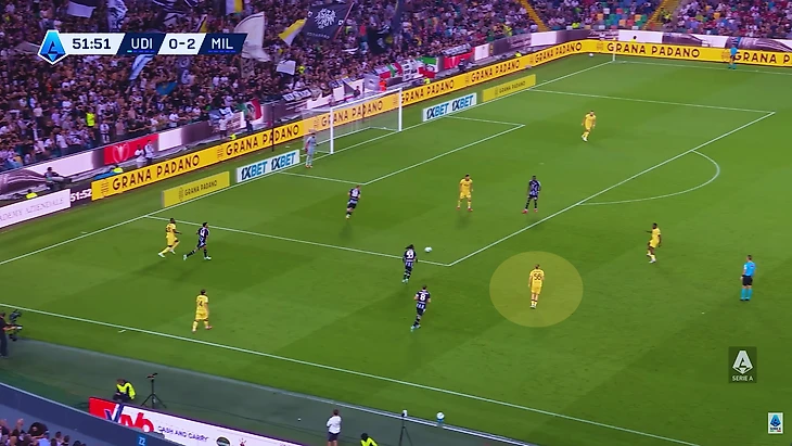 Аллегри один из последних тренеров в Серии А, который обороняется зонно. Его игроки не преследуют соперников один на один, а насыщают отдельные участки – как правило, зону вдоль коридора паса. Игрока на фланге часто не замечают. Это ловушка: Макс провоцирует поперечную передачу.