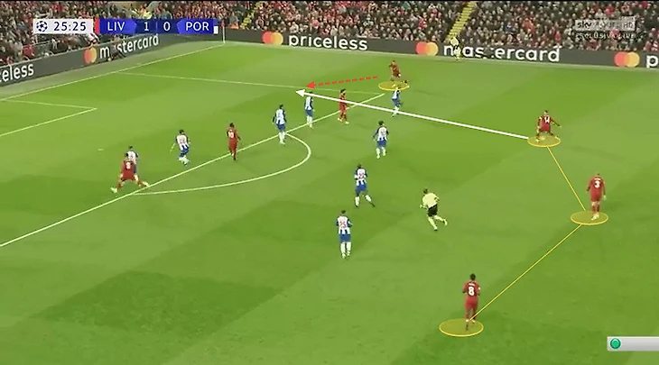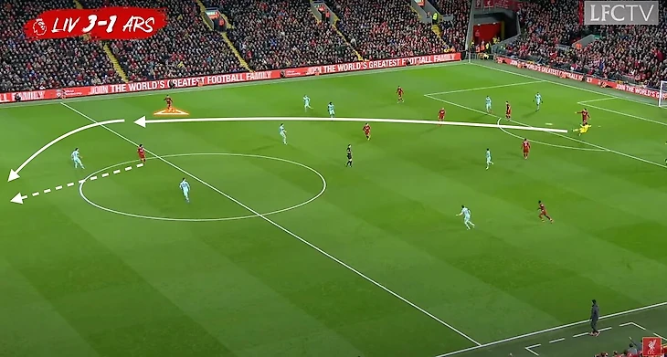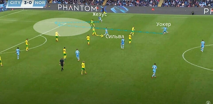 На примере мы можем видеть, как Уокер с мячом специально делает паузу, ждет, пока Сильва уведет игрока; Жезус тоже ждет, когда Уокер будет готов к передаче, чтобы потом оторваться от соперника и вбежать в освобожденное пространство.