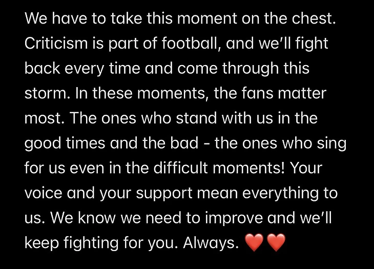 «Мы должны принять этот момент как должное. Критика – это часть футбола, и мы будем давать отпор каждый раз и пройдем через эту бурю. В такие моменты фанаты важнее всего. Те, кто поддерживает нас и в радости, и в горе, те, кто поет для нас даже в трудные моменты! Ваш голос и ваша поддержка значат для нас все. Мы знаем, что нам нужно совершенствоваться, и мы будем продолжать бороться за вас. Всегда».