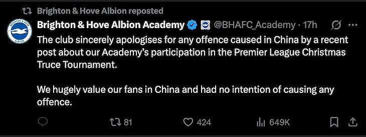 «Брайтон» отреагировал официальным заявлением: «Клуб искренне извиняется за любые оскорбления, нанесенные Китаю недавним постом об участии нашей академии в турнире Премьер-лиги «Рождественское перемирие». Мы очень ценим наших болельщиков в Китае и не имели намерения кого-либо оскорбить».