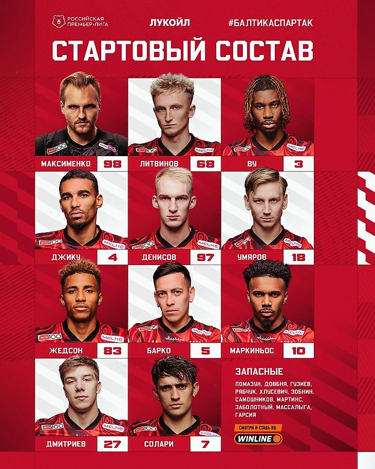 «Спартак»: Максименко (к), Джику, Ву, Денисов, Дмитриев, Умяров, Литвинов, Барко, Жедсон, Солари, Маркиньос.
