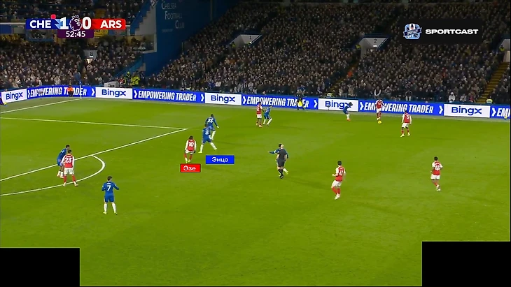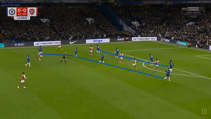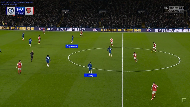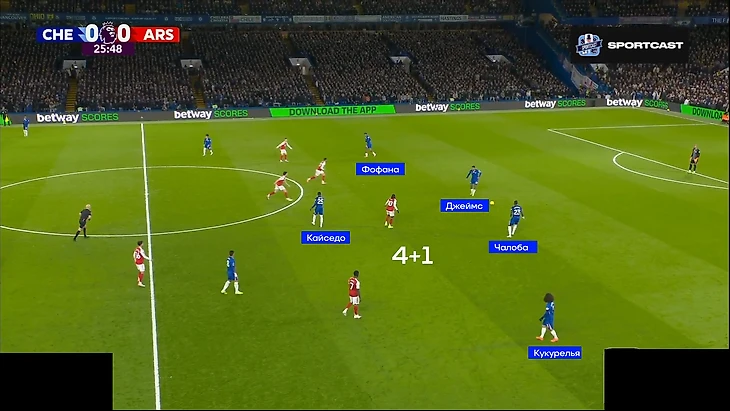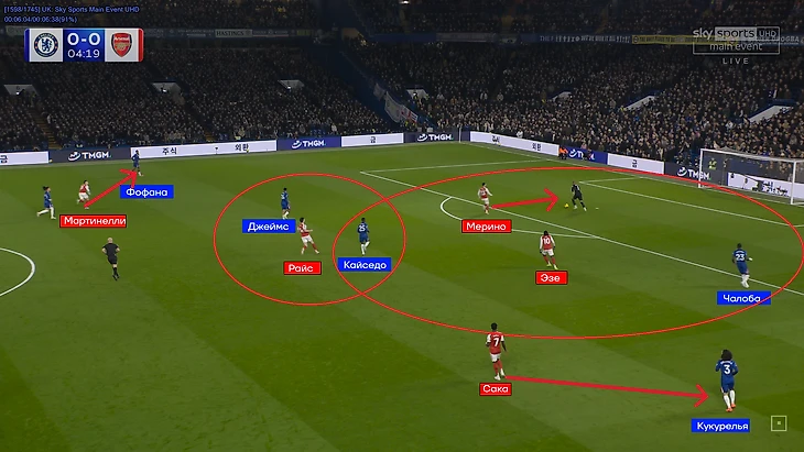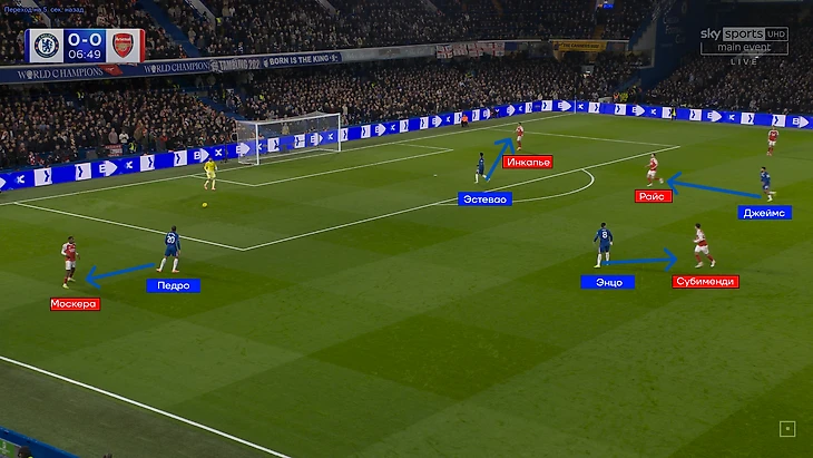 Игроки за пределами основной пятерки в билд-апе практически не опускались ниже для помощи в розыгрышах. Это тоже сознательное решение тренера, ведь после выхода из-под прессинга «Арсенала» те, кто остался выше, получали большое количество свободных зон. Особенно хорошо бреши в обороне соперника отыскивал Энцо Фернандес.