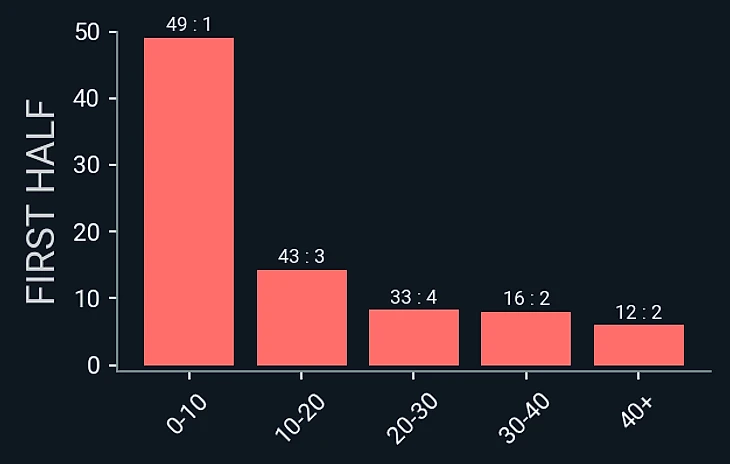 Тем не менее, даже в такой ситуации, «Челси» позволял себе вылазки на чужую половину без мяча. До конца тайма Энцо Мареска оставил указание давить на розыгрыши соперника, что хорошо видно по графику PPDA50 (количество передач соперника на количество отборов в радиусе 50 метров от ворот «Арсенала»).
