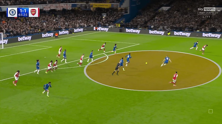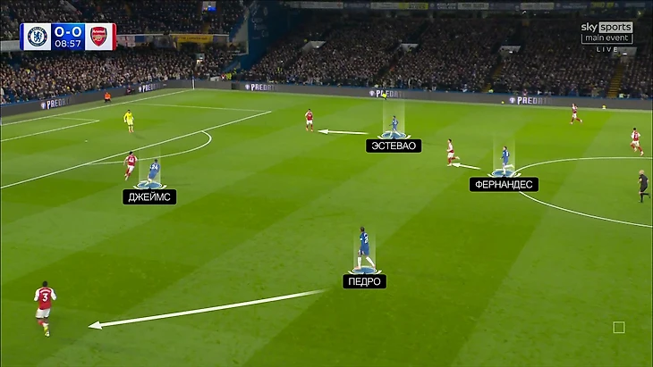 Но в собственном давлении «Челси» был не менее убедителен, чем «Арсенал». Они как раз использовали модель с персональными ориентировками по всему полю. По этой причине Рис Джеймс мог оказываться выше всех, при давлении играя против Деклана Райса.
