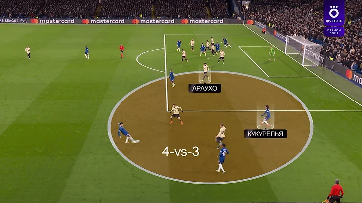 Для создания персоналок на линию с Педро понимался Эстевао. Это означало, что на правом фланге действует Гюсто, а слева – Нету. Следовательно, Кукурелья мог оставаться глубже для сдерживания Сака. В рамках этой модели прессинга Мареска может выбрать фланг, где происходит описанная трансформация. В данном случае выбор правой стороны вполне понятен.