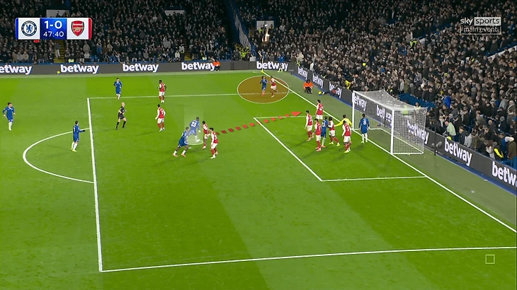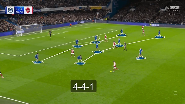 Вместо того, чтобы менять Кайседо напрямую, Мареска опустил в опорную Энцо Фернандеса. Возможно, держал в уме, что «Арсенал» не любит атаковать через центр и задействует, правило, края. Основная схема в обороне – 4-4-1. Классика команд, которые остались в меньшинстве.