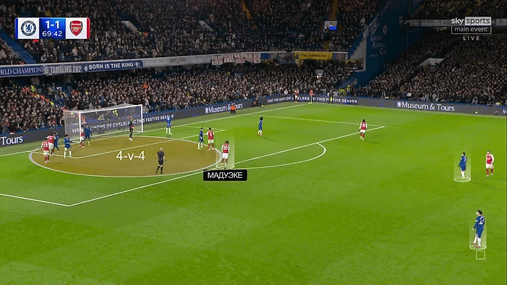 Несмотря на то, что угловой подает «Арсенал», отправили сразу трех игроков к центральному кругу. В штрафной – четыре дуэли 1-в-1 без подстраховки. Без соперника – только Чалоба и Санчес. На границе штрафной совсем один Мадуэке.