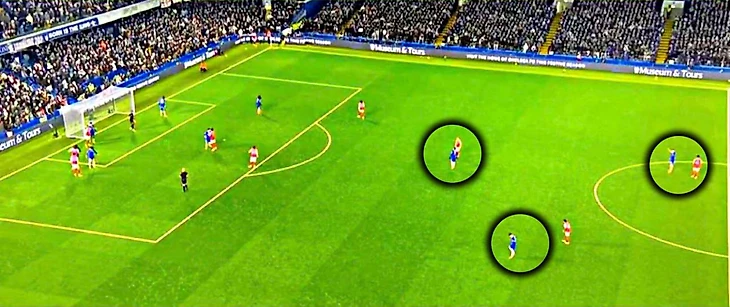 Яркий момент — угловой у ворот Санчеса, а 3 футболиста «синих» стоят в центральном круге, ожидая контратаку (ну и плюсом вытягивая из своей штрафной 3-х соперников).