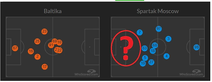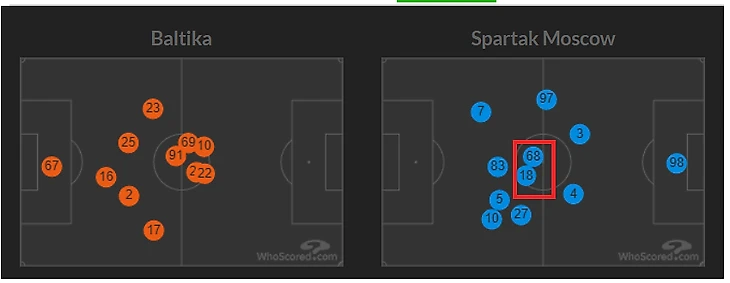 2) «Спартак» вышел с «закрытой» средней линией. В центре появилась связка двух разрушителей Умяров - Литвинов. Которая ранее в этом сезоне вообще не использовалась. На «усредненных позициях» хорошо заметно использование «спаренного центра».