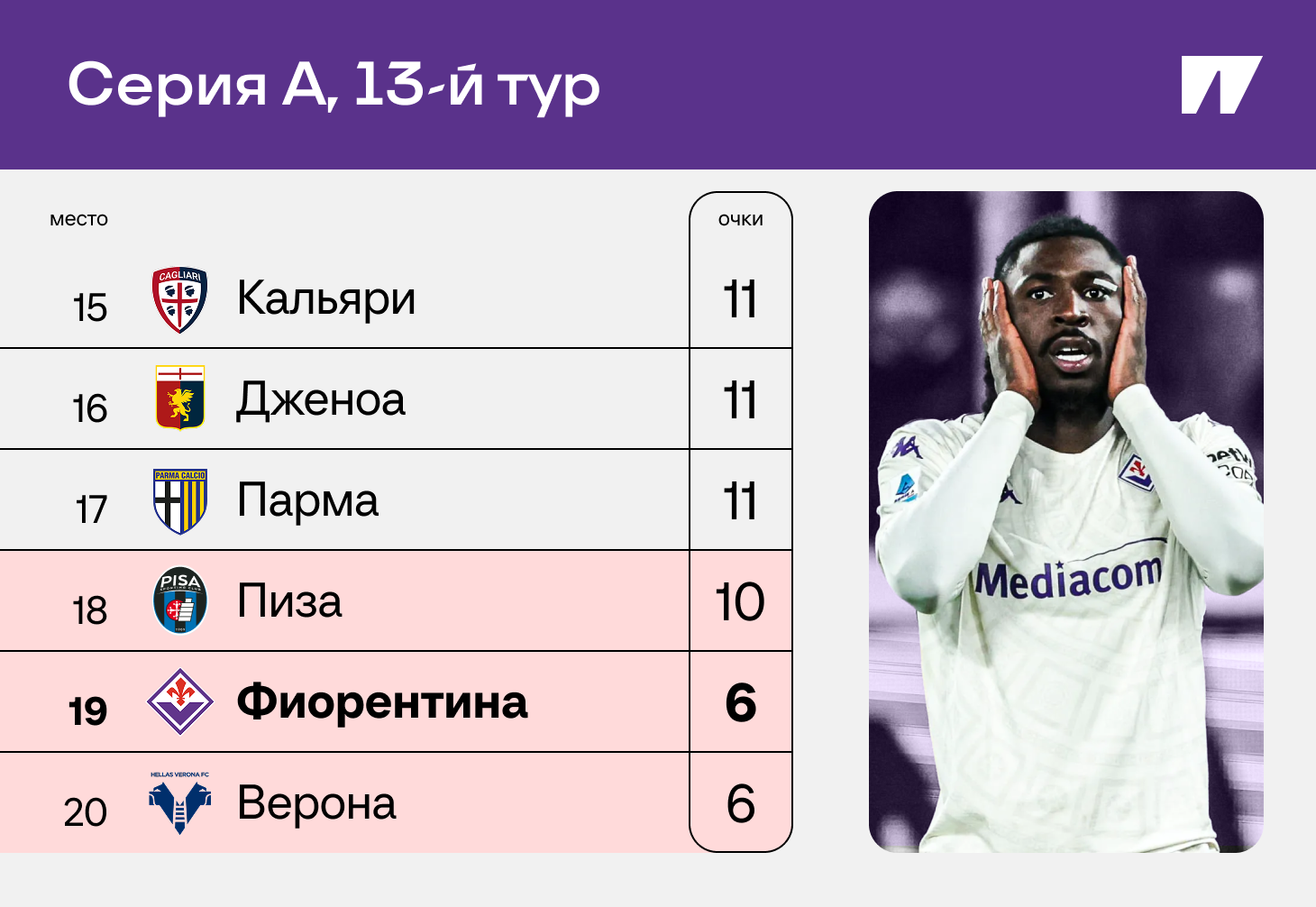 В Серии А за 10 матчей с Пиоли «Фиорентина» не победила ни разу, составив компанию одной «Вероне»: набрала всего четыре очка, неудачно играла с явными аутсайдерами (ничья с «Пизой», поражение от «Лечче») и показала худший старт в истории клуба. Перед ноябрьским международным перерывом «Фиорентина» оказалась последней.