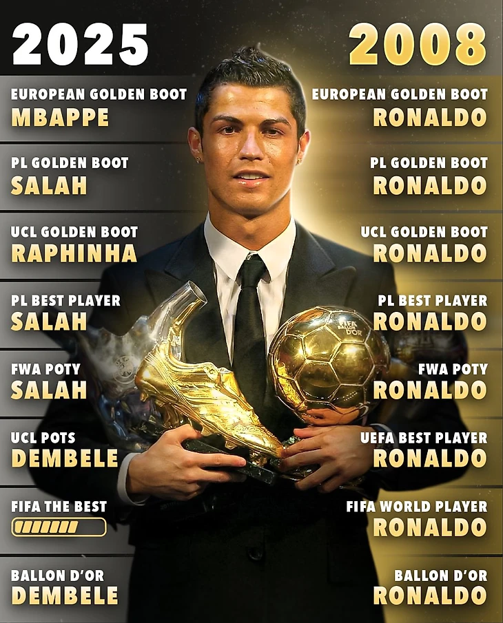 Слева — сезон 2025, где топ-награды поделили сразу несколько звезд: Мбаппе, Салах, Рафинья, Дембеле.