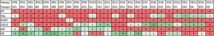Классификация позиций футболистов: вратарь (в таблицах и графиках «ВРТ»), защитник (в таблицах и графиках «ЗАЩ»), фланговый полузащитник/нападающий (в таблицах и графиках «ФЛАНГ»), центральный полузащитник (в таблицах и графиках «ПОЛУЗ»), центральный нападающий (в таблицах и графиках «НАП»), тренеры без достаточного игрового опыта (в таблицах и графиках «БЕЗ»).