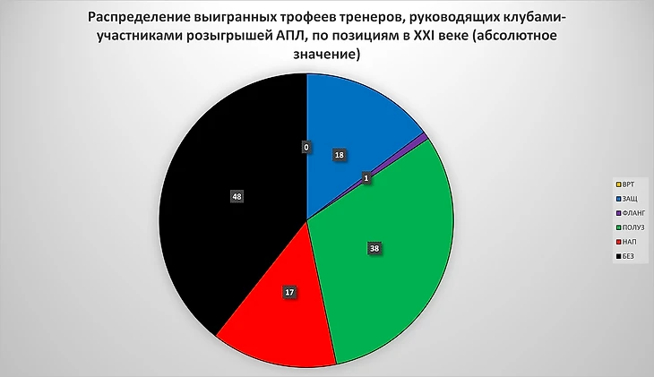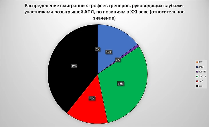 Доля выигранных трофеев тренерами экс-защитников, что гипотетически можно обосновать тем, что данные специалисты в большей степени уделяют внимание обороне и, как производный стиль, – оборонительному. Это не всегда входит в сферу интересов больших команд, темпераменту и настрою игроков больших команд, которые в первую очередь делают ставку на игру «первым номером» для привлечения и удержания большего количества болельщиков. Но это лишь домыслы, конечно. Глобально данная тенденция нуждается в более глубоком анализе.