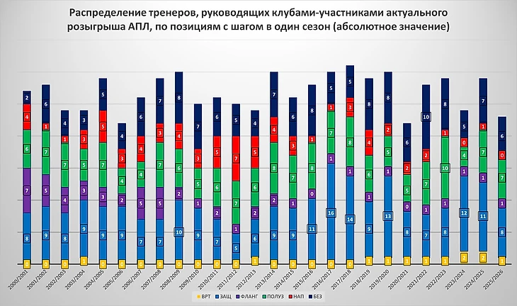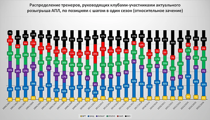 В это время экс-игроки защитной и средней линий, имеющие более комплексное представление обо всех этапах игры, формировании взаимодействия, выстраивания командной игры, на начальной позиции имели большее количество знаний, умений и навыков, дальнейшее развитие которых позволяло получать назначения в клубы АПЛ, где уже соревновались одни из лучших специалистов.