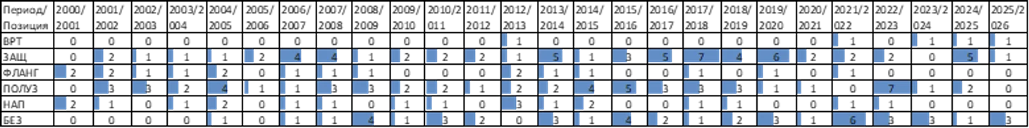 Из диаграмм и гистограмм можно заметить низкое количество периодов тренерской работы экс-вратарей, сокращение количества экс-фланговых игроков и нападающих. Объяснить данный феномен можно модусом операнди и вовлеченностью в различные игровые стадии футболистов, выступающих на данных позициях. Если вратарь – позиция, которая изначально предусматривает особый темперамент и по уровню задействования в различных фазах игры крайне ограничена, и чаще всего экс-голкиперы становятся тренерами для будущих вратарей, то мышление нападающих и фланговых игроков в большей степени эгоцентрично и антисистемно. Их основная сфера деятельности и задача (особенно на том этапе развития игры в лиге) – разрушение построений соперников за счет, чаще всего, своих особых данных и талантов и в меньшей степени участие и анализ всех стадий игры команды. Советую пересмотреть матчи того времени и обратить внимание на ограниченность задач игроков того времени. Соответственно, подобные условия не способствуют формированию ключевых компетенций для позиции главного тренера команды. Безусловно, за счет громкого имени или прошлого послужного списка для уже тренировавших игроков на старте можно было получить назначение, но с дальнейшим развитием лиги фильтры для выбора главного тренера стали более жесткими.